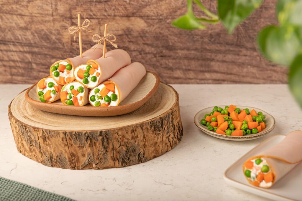 Involtini di fesa di tacchino ripieni di formaggio spalmabile e verdure al vapore